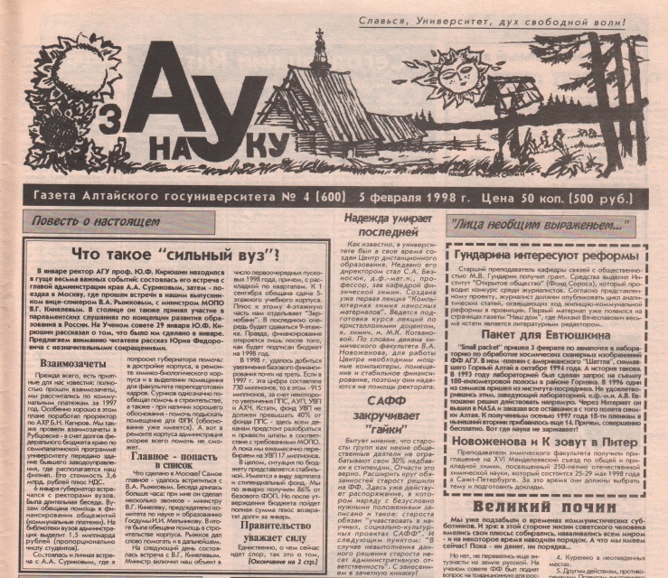 600 номеров газеты “За науку” промелькнули, как 600 секунд. А между тем за эти почти 18 лет сменились три эпохи: последняя спокойная “пятилетка” СССР, эпоха ломки и развала великой империи (“перестройка”) и, наконец, возрождение России (“капитализация”).