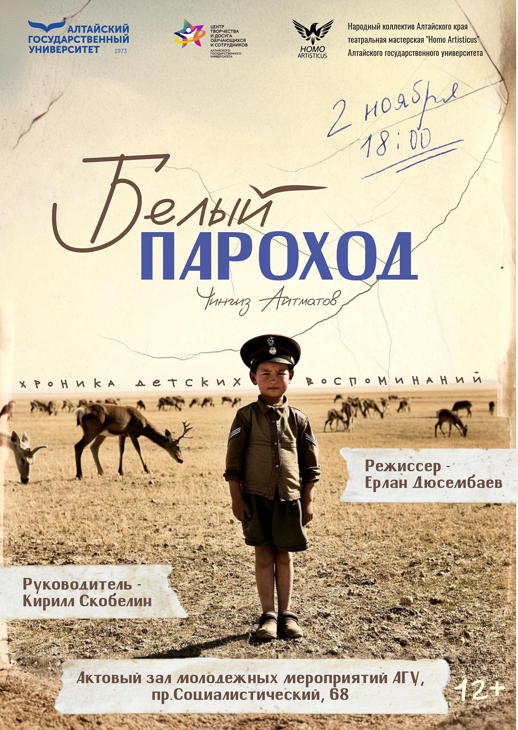 2 ноября 2025 года в актовом зале молодежных мероприятий корпуса С (пр. Социалистический, 68) состоится премьера спектакля театральной мастерской Homo Artisticus «Белый пароход» по одноименной повести Чингиза Айтматова. Режиссером постановки стал Ерлан Дюсембаев. Вход на спектакль свободный.