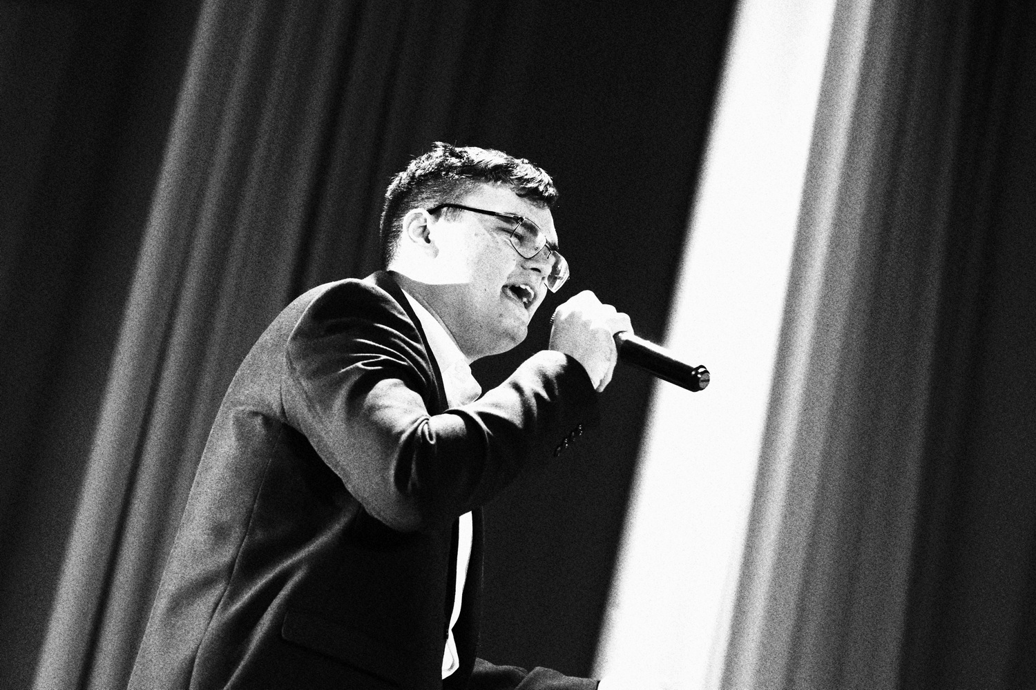 Номер «Мы молодые – надежда страны» Тамирлана Урусканова. Студент исполнил песню. Позади выступающего развевался флаг Российской Федерации, а гражданский порыв, с которым Тамирлан пел, однозначно захватил внимание зрителей. Многие подпевали. Под конец номера зал растворился в аплодисментах. Гордо и патриотично.