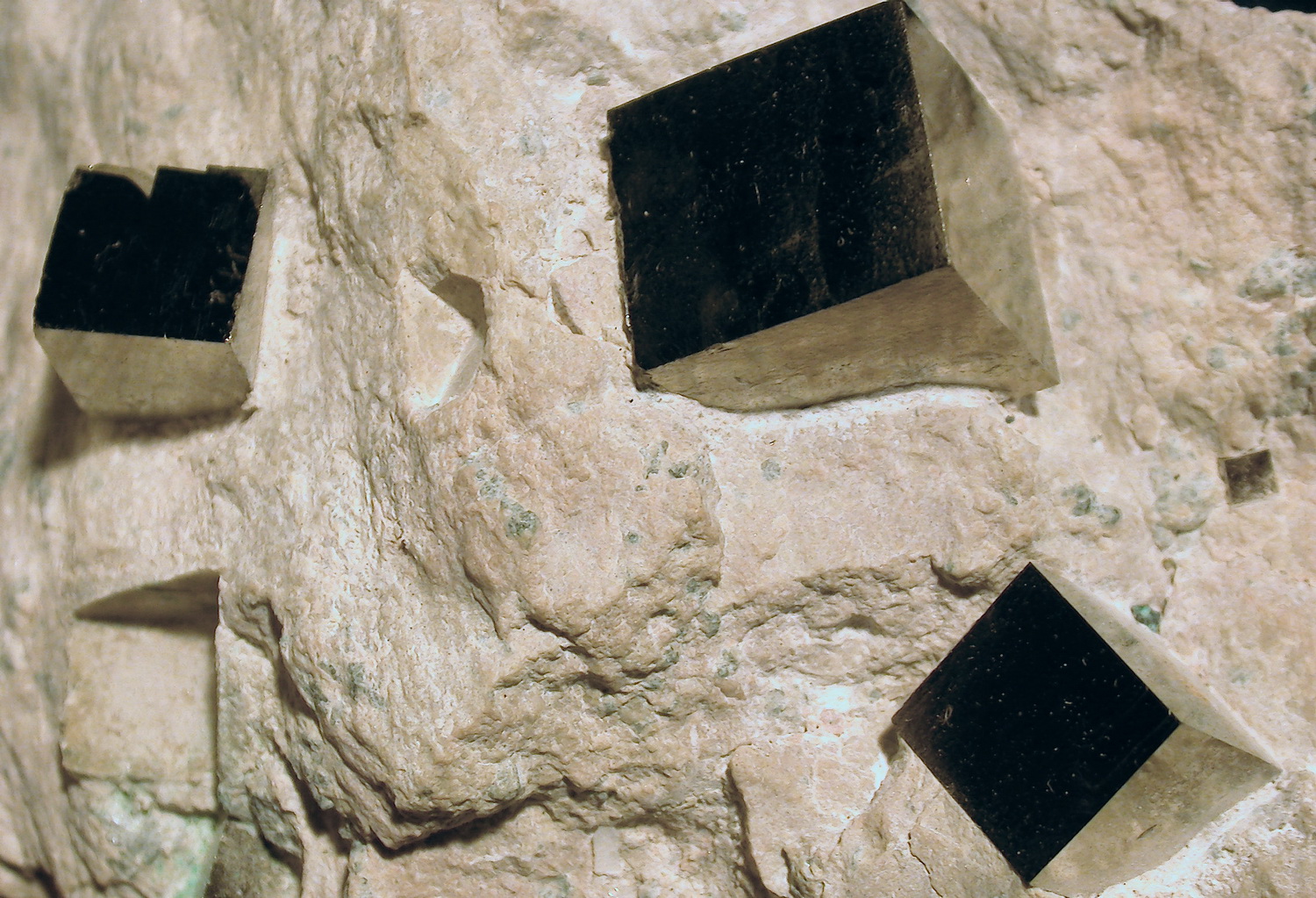 Кубические кристаллы типичного халькогенида – пирита (персульфида железа FeS2) в основной породе.