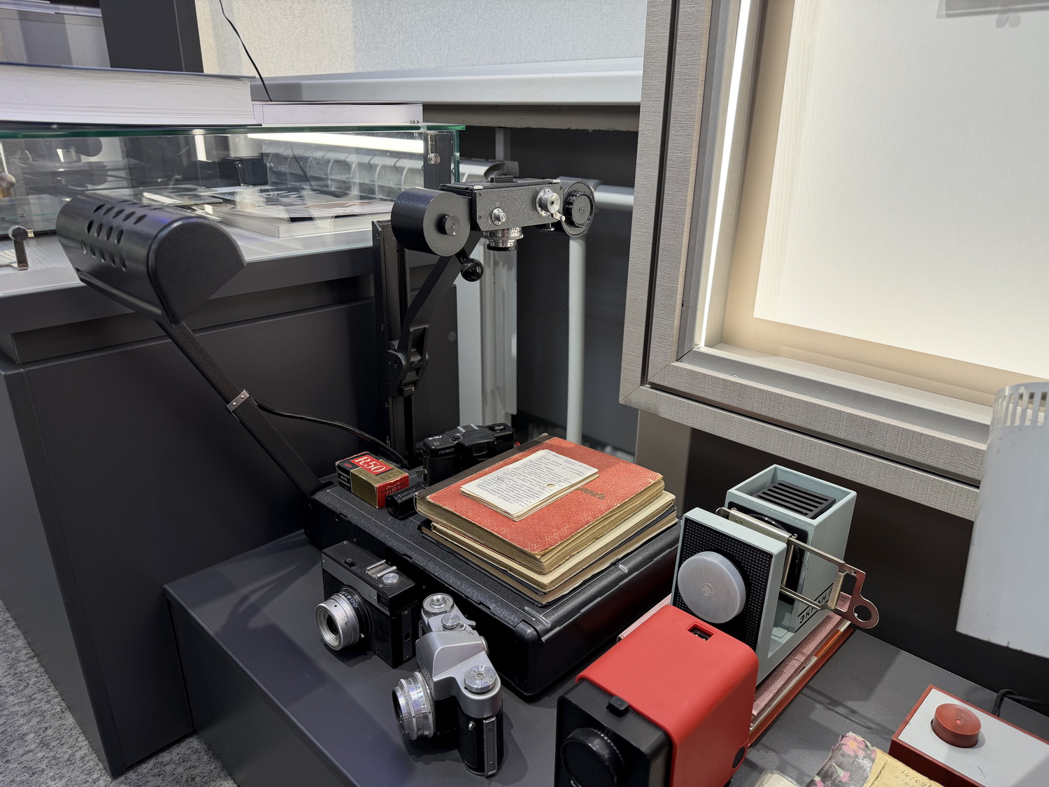 В музее хранится и материальная память советской техники: пишущие машинки, телефоны, фотоаппараты, проекторы. Особое место занимает репродукционная установка С-64 «Елка» – уникальный образец советской фототехники, широко применявшийся органами внутренних дел с 1960-х по 1990-е годы. Название «Елка» возникло из-за характерной формы аппарата: вертикальная конструкция с рядами ламп, напоминающих ветви новогодней елочки. С помощью этой установки делали репродукции документов, следов пальцев, фотоснимков как для уголовных, так и для личных дел. Рядом – коллекция фотоаппаратов, отражающих, так скажем, эволюцию визуальной фиксации в СССР. Среди них – легендарный надежный и простой, почти неразрушимый аппарат «Зенит-3М». Он служил десятилетиями не только профессиональным фотографам, но и студентам, архивистам, преподавателям, всем, кто любит снимать.